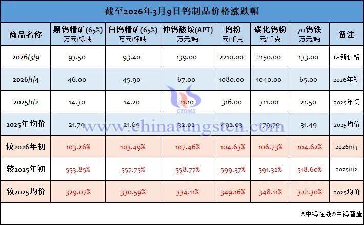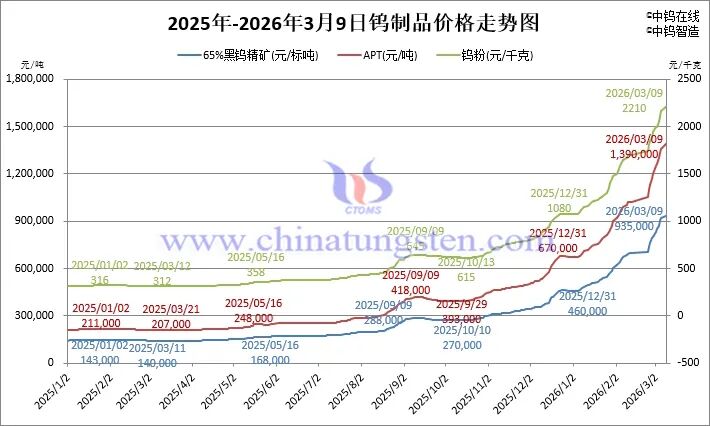 周一,钨市场行情迭创新高,两个多月即实现价格翻番的强劲势头暂未见休整,国内外钨价共振上行。在钨原料市场坚挺气氛的带动下,钨废料端套现意愿减弱,惜售待涨氛围增加。据中钨在线调研,在供给增量有限、需求刚性保持、战略属性重估与投机资金介入的背景下,业者认为钨价整体强势格局将延续,但需警惕短期内较高涨幅带来的周期性回调风险,建议参与者在波动中把握理性节奏。